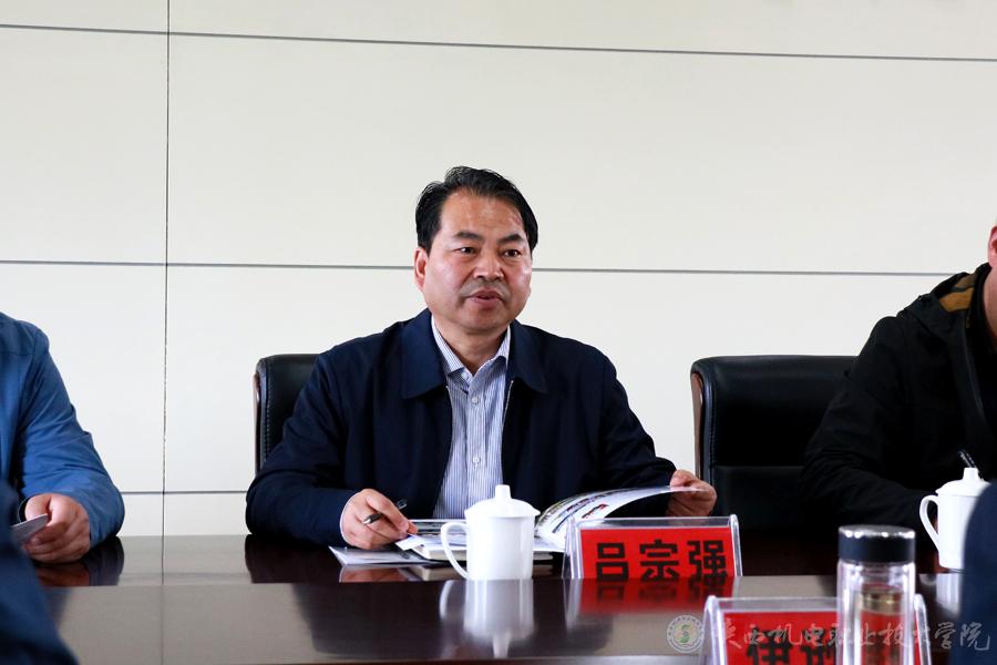 吕宗强肯定了双方在2018年“双百工程”中取得的成绩,感谢陕西机电学院教育帮扶和科技扶贫所做的大量工作,尤其是2018年学院在眉县建设的两个基地工作推进效果明显。2019年眉县教体局将主动与陕西机电学院院联络,全力支持“双百工程”工作。结合本单位实际对接工作,确保项目的组织实施;更要加强与陕西机电学院联系,注重完善工作机制。要加大宣传力度,确保贫困户切实受益,并希望陕西机电学院院从扶贫扶志上给予眉县长期的帮助。