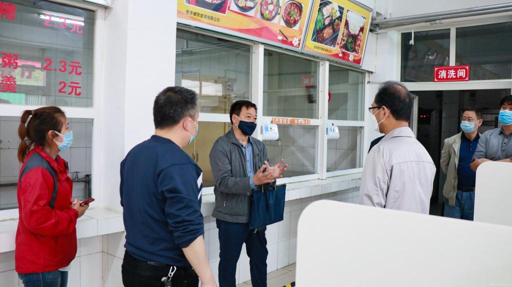 检查组一行对学校门卫体温检测点、校医室、宿舍、隔离室、教学楼、食堂等重点防控区域进行了实地查看,并详细询问了我校防疫防控物资准备、人员健康准备、返校准备、教学准备和应急准备等具体工作情况。