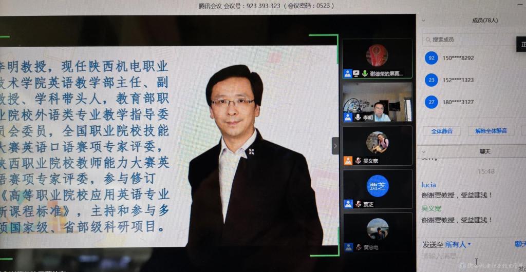 李明大会做题为《以赛促教、以赛促改——从技能大赛谈高职英语课堂教学改革》的线上报告