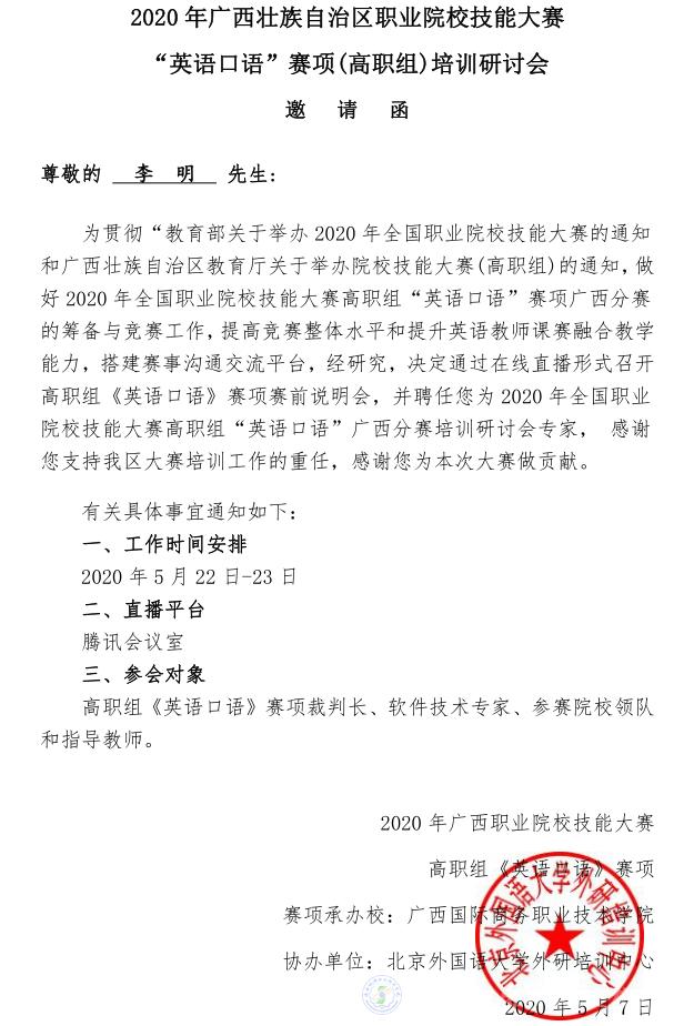 2020年5月22-23日,由广西壮族自治区教育厅主办,广西国际商务职业技术学院、外语教学与研究出版承办的广西职业院校技能大赛英语口语赛项培训研讨会隆重举办。为支持疫情防控工作,本次会议以线上研讨的形式、依托腾讯会议平台进行。