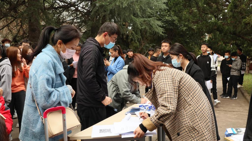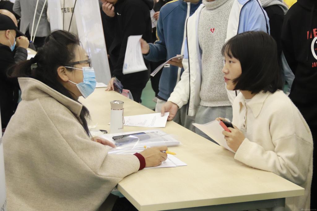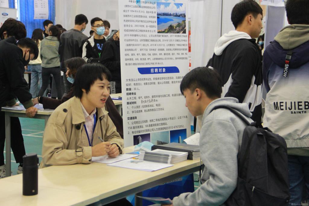上午,毕业生及用人单位代表不畏秋意寒风,早早就来到校园招聘会现场,开启了求职、面试工作。招聘会现场气氛热烈,用人单位细致周到的向毕业生介绍企业发展、工作内容、薪资待遇等情况;毕业生热情大方的向用人单位介绍、展示自我,寻找适合自身的工作岗位。