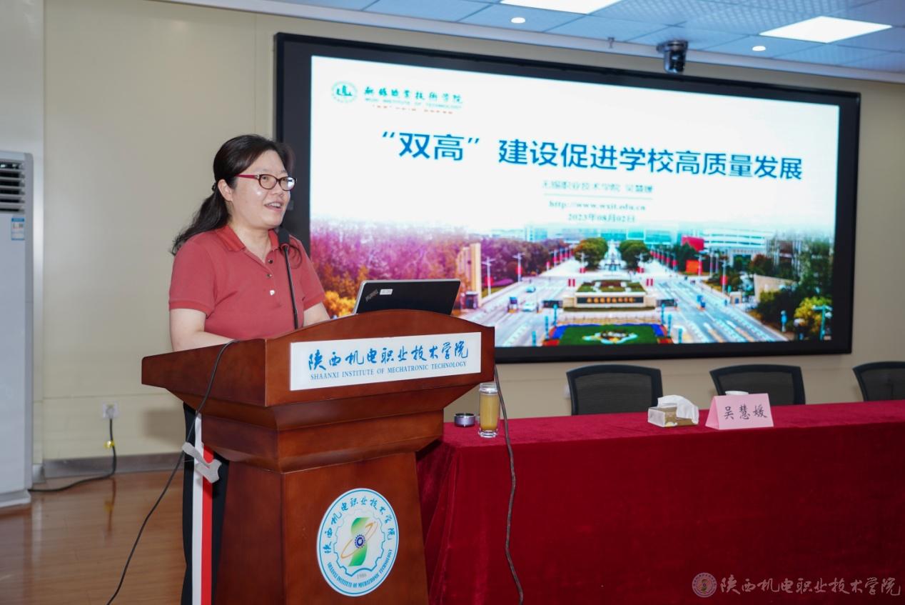学习交流会分为两个阶段,第一阶段由吴慧媛副校长为我校做《“双高”建设促进学校高质量发展》专题讲座,讲座由张克副院长主持。吴慧媛副校长从职业教育的机遇与挑战、“双高计划”建设与措施、绩效评价、高质量发展路径四个方面进行详细阐述,为我校“双高”建设、高质量发展提供思路。