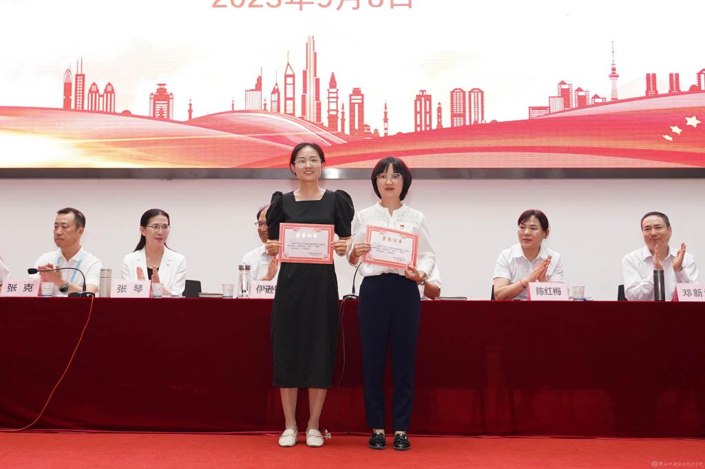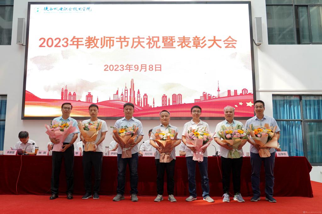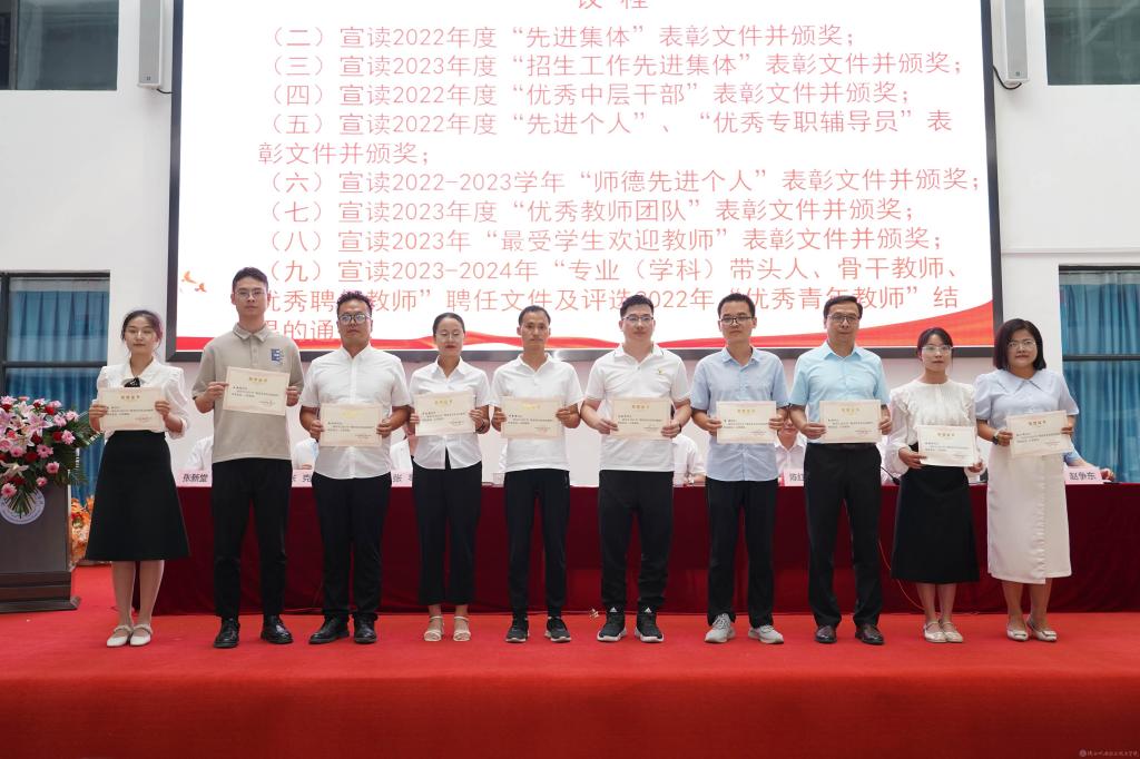 党委副书记张琴同志宣读《陕西省教育厅关于表彰第十三届陕西高职院校教学名师奖获奖教师的通知》并授予鲜花;宣读2022年度“先进集体”,2023年度“招生工作先进集体”表彰文件并颁奖。