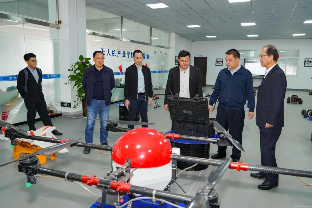伊逊智、向纪明陪同梁松寿一行参观了学校风标产业学院、京东数字处理产业基地、无人机产业学院、擀面皮产业学院等。