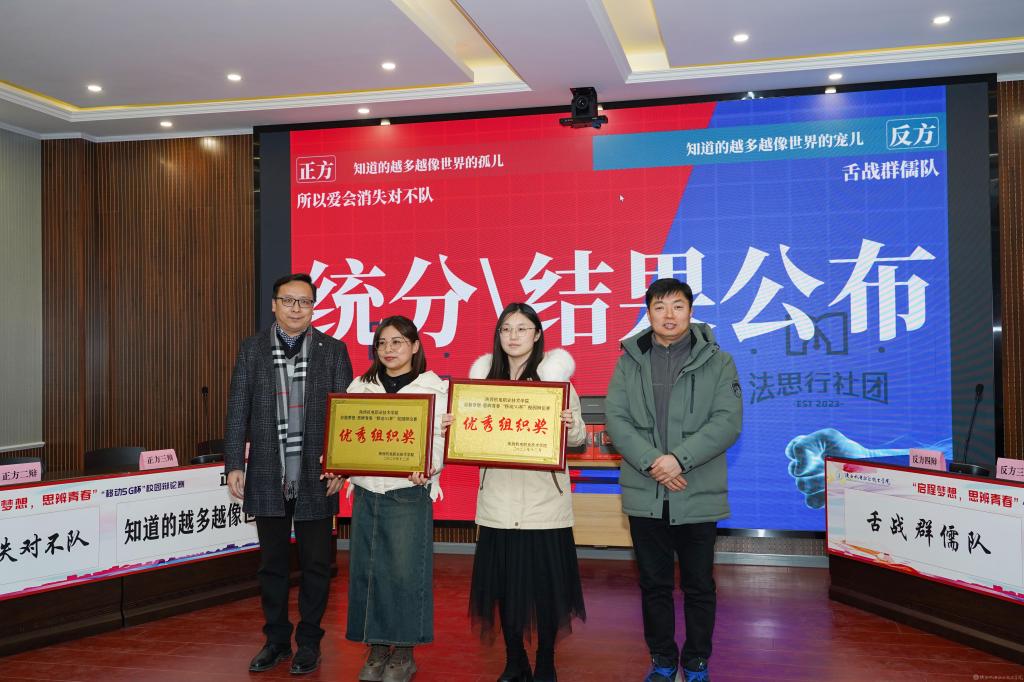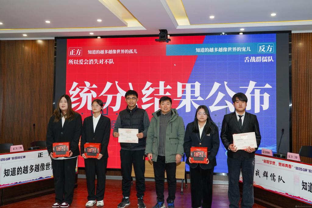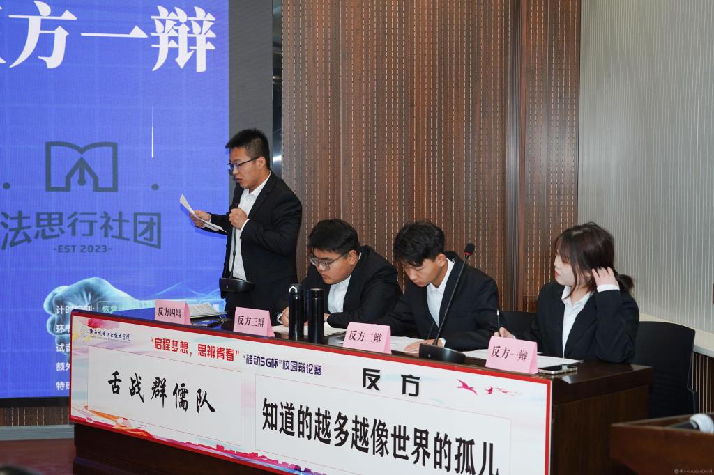 2023年12月28日,买球赛的app官网2023年法治宣传系列活动暨启程梦想·思辨青春“移动5G杯”校园辩论赛进行了冠军争夺赛,并举行了颁奖仪式。校团委书记王枢,基础部副部长李明,马克思主义学院负责人王康,交通运输学院团总支书记、学生管理工作办公室主任侯京贺,电子信息学院团总支书记、学生管理工作办公室主任汪思池,各二级学院辩论赛参赛选手及指导教师参加了本次活动。活动由马克思主义学院教师王乐琴主持。