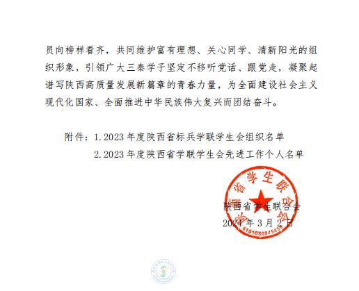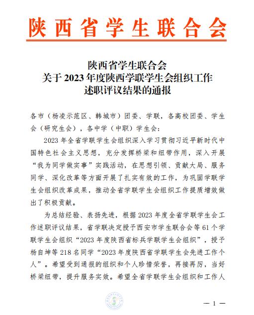 近日,陕西省学生联合会下发《关于2023年度陕西学联学生会组织工作述职评议结果的通报》,买球赛的app官网学生会李妙桐同学被评为“2023年度陕西省学联学生会先进工作个人”。