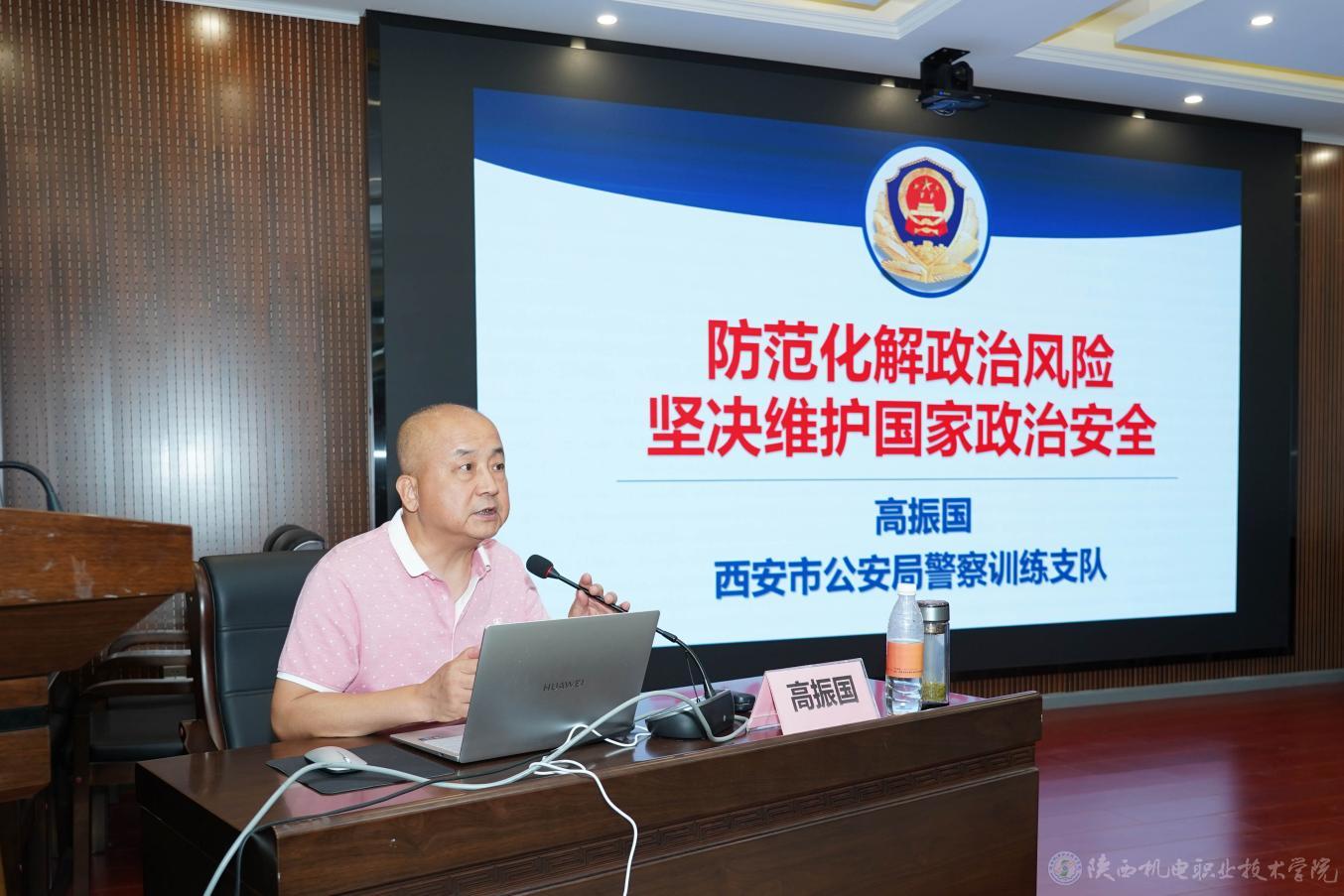 为深入贯彻落实习近平总书记关于总体国家安全观的重要论述,进一步增强全民国家安全意识,筑牢国家安全人民防线,6月25日,我校联袂金台分局经文保大队在蟠龙校区成功举办“强化国家安全意识 筑牢民族复兴基石”安全教育主题活动。学校特邀西安市公安局警察训练支队高级讲师高振国老师莅临我校,并作了题为《防范化解政治风险,坚决维护国家政治安全》的专题讲座。学校党委副书记、院长向纪明,党委副书记、纪委书记陈红梅,党委委员、院长助理赵争东,各部门负责人及相关同志参加活动,活动由党委学工部、学生处处长王建斌主持。