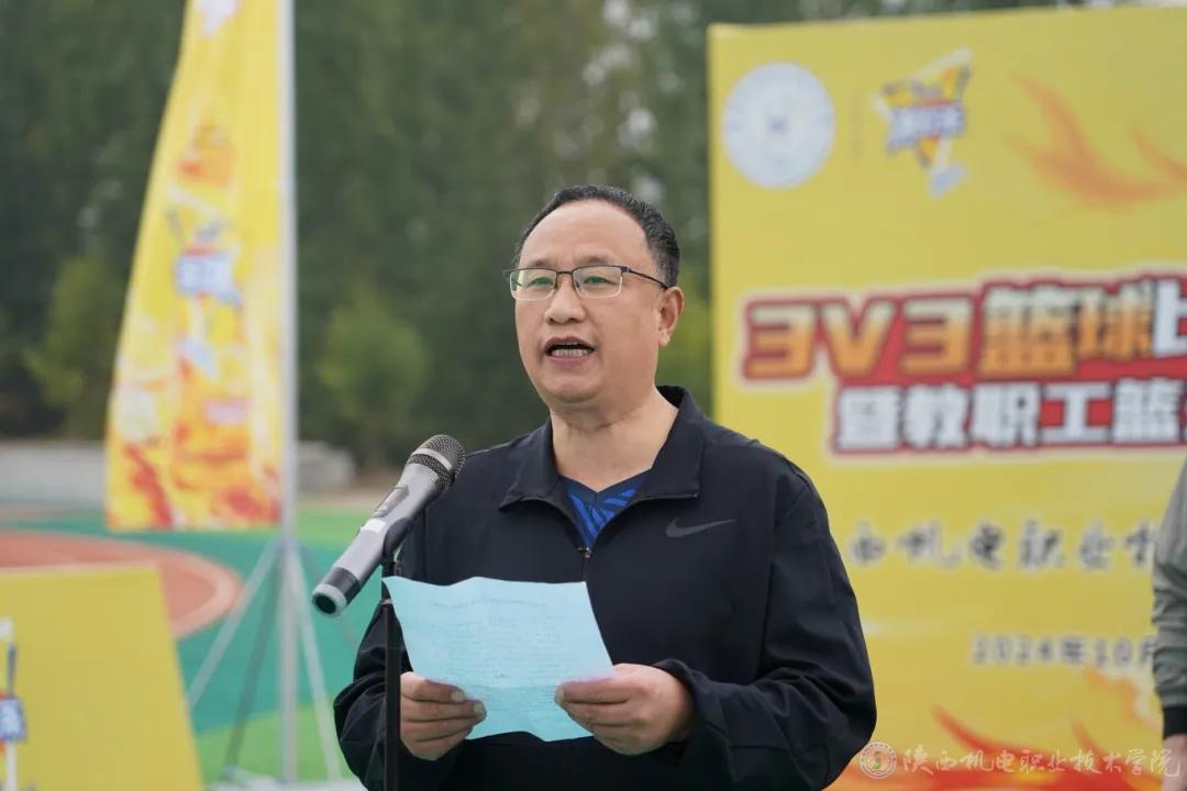 10月17日下午,买球赛的app官网2024年教职工篮球比赛在蟠龙校区西操场开赛。校党委书记伊逊智,党委副书记张琴,党委委员、宣传部部长、工会主席李明,党政办公室副主任,工会副主席康健出席开幕式。党委副书记、院长向纪明致开幕辞。基础部(体育部)副部长李明主持开幕式。