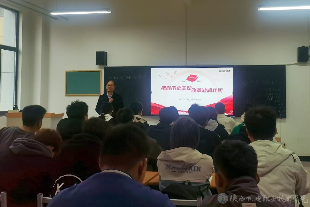 11月11日下午,买球赛的app官网党委书记伊逊智在博学楼218教室为24现场工程师、24电子信息1、2合班学生上形势与政策课,讲授《改革的实践续篇,现代化的时代新篇》专题内容。