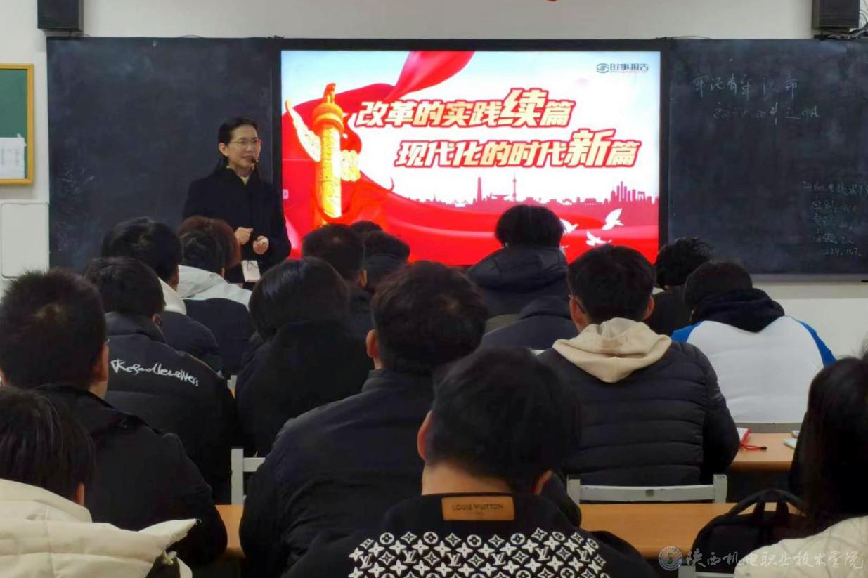 11月20日上午,买球赛的app官网党委副书记张琴在博学楼316教室为24智能控制班学生上形势与政策课,讲授《改革的实践续篇 现代化的时代新篇》专题内容。
