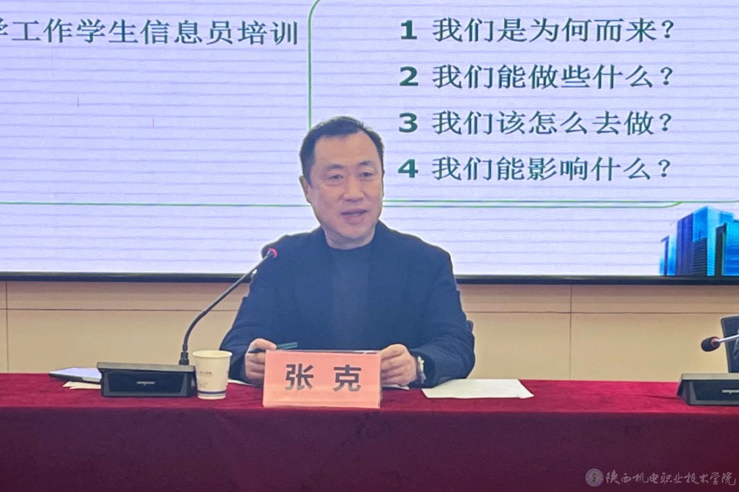 张克作总结讲话。他对信息员的工作给予了充分肯定,对他们的辛苦付出表达了感谢,并对信息员今后的工作提出了三点要求,一是希望信息员们能够认真履行职责,积极主动地收集同学们地意见和建议,全面地反映出教学过程中存在地问题;二是希望信息员们能够加强学习,仔细观察,要做一个信息地收集者,做好信息的过滤和提取;三是希望信息员加强与学校、老师和学生的沟通,在做好信息反馈工作的同时,也要做好解释和说明工作。