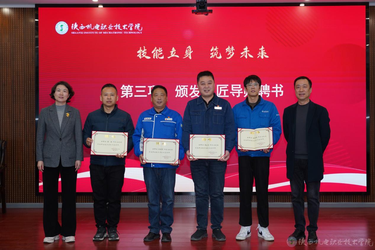 大国工匠、航天九院7107厂数控铣工、特级技师刘湘宾(刘湘宾的徒弟毛国刚代),2024年大国工匠培育对象、省劳动模范、陕西法士特汽车传动集团有限责任公司维修电工、高级技师蔡嵘,陕西省技术能手、中铁工匠宝桥集团高级技师陈盟分别与师生代表共同签订“师带徒”协议书。