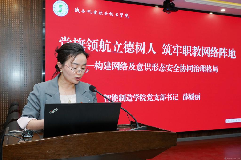 王建斌以《提升学生网络安全意识 强化学生意识形态教育》为题,围绕“做好学生网络使用的正确引导者”“做好学生主流意识形态的塑造者”将正确的价值观、世界观融入日常学工管理中。白娟娟以《筑牢思想安全防线 赋能教育数字化转型》为题,通过强化思想引领、内容供给、课堂创新不断筑牢“防火墙”、织密“过滤网”、激活“主阵地”,将意识形态工作贯穿人才培养的全过程。薛媛丽以《党建领航立德树人 筑牢职教网络阵地——构建网络意识形态安全协同治理格局》为题,围绕学校“九维育人”总要求,依托学生模拟党支部建设,致力于构建“预见风险-阻断风险-转化风险”治理闭环的长效机制。