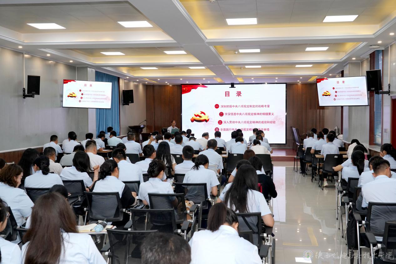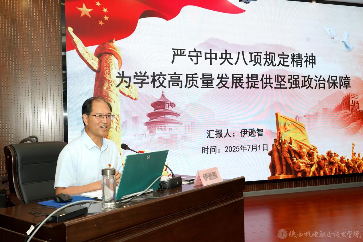 伊逊智指出,中央八项规定的制定是我们党加强作风建设的重大举措、解决党内突出问题的迫切需要、党在新时代的徙木立信之举。中央八项规定精神的精髓要义是厉行勤俭节约、反对奢侈浪费和奢靡之风、廉洁从政、工作作风务实。中央八项规定精神在全党的落实,刹住了一些长期没有刹住的歪风,纠治了一些多年未除的顽瘴痼疾,党风政风社风焕然一新,党心军心民心高度凝聚,推动全面从严治党向纵深发展,开辟以伟大自我革命引领伟大社会革命新境界,在党的建设史上具有重要里程碑意义。他要求全校党员干部要压实领导责任、发挥头雁效应,深化以学砺行、淬炼过硬作风,坚持镜鉴常省、筑牢思想堤坝,及时凝练总结、健全长效机制,以高度的政治担当、饱满的奋进姿态、过硬的实干作风,坚决落实中央八项规定精神及其实施细则,将“严”的要求贯穿“双高”建设全链条、各环节,以清正之风护航学校事业行稳致远,为服务区域产业升级、助推地方经济社会发展培养更多德技双馨、堪当大任的能工巧匠与大国工匠。