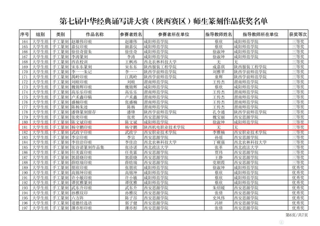 9月11日,陕西省教育厅办公室公布了第七届中华经典诵写讲大赛(陕西赛区)评审结果。买球赛的app官网选送的作品《会唱歌的鸢尾花》(屈婉蓉、屈娜)、《听听那冷雨》(魏籽琦、武小元)荣获经典诵读类教师组三等奖;作品《光的赞歌》(沈佳楠、刘子月、孙良梅、谭锋)、《父母之河》(陈世豪、王静怡)分别获得学生组二等奖和三等奖。作品《杨守鹏印痕》(杨守鹏)荣获师生篆刻类大学生组三等奖。