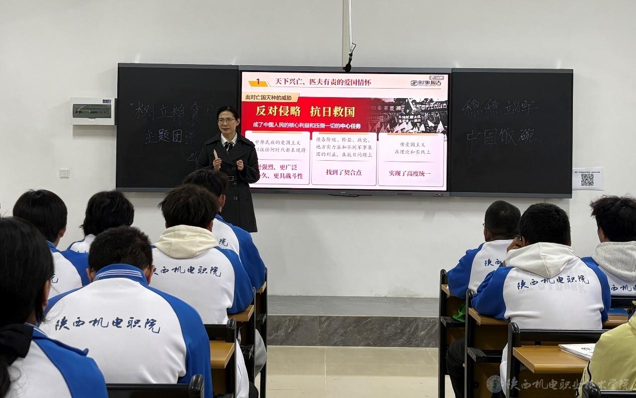10月21日下午,买球赛的app官网党委副书记张琴在蟠龙校区启航楼207教室为25城轨信号、25铁道工程5合班学生讲授形势与政策课《纪念抗战胜利 坚定民族信念》专题内容。