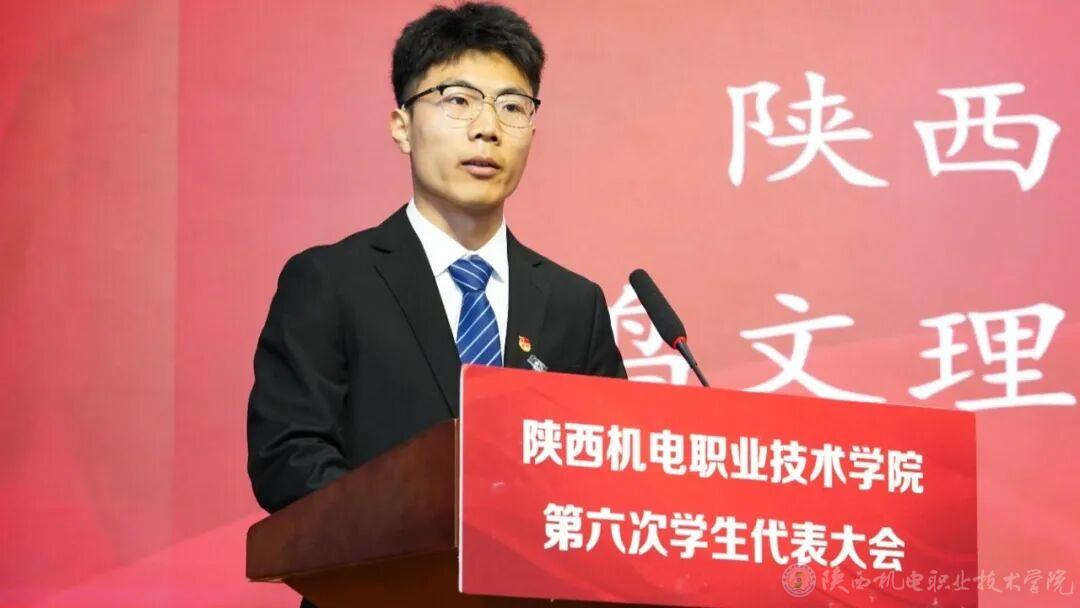 第五项,陕西省学生联合会代表,宝鸡文理学院学生会主席团成员王奇代表陕西学联致辞。王奇表示,我们学生会成员要始终牢记初心使命,聚焦主责主业,持续推进学生会革新,展现出昂扬的斗志与凝聚力,团结带领全校青年主动回应时代挑战,不辜负时代期望和青春赋予的使命,始终以真挚的情怀、拼搏的姿态、务实的作为,书写更加壮丽的青春答卷。