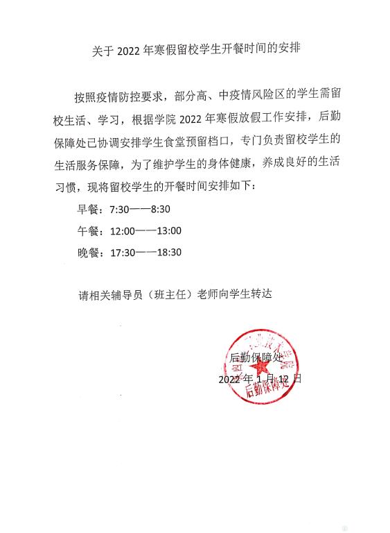 关于2022年寒假留校学生开餐时间的安排