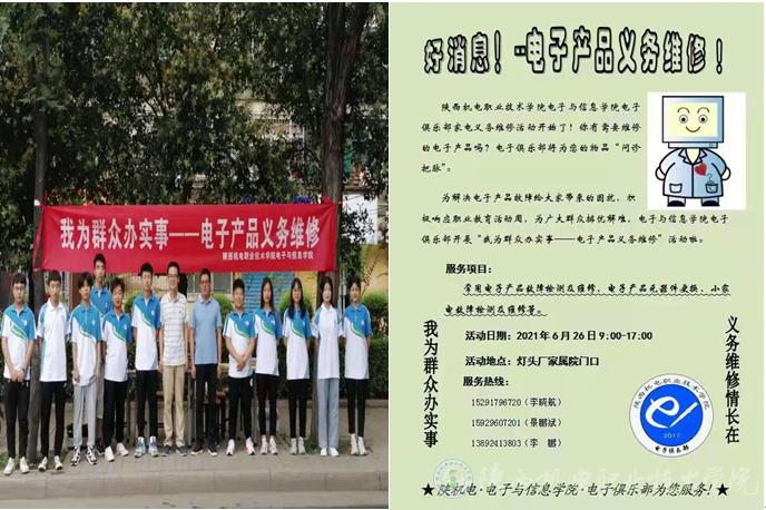 “学党史、践行动,解决群众身边的困难!”6月26日,在学校电子与信息学院支部书记高赋、教师景鹏斌和李鹏带领和指导下,电子俱乐部师生在宝鸡市灯头厂小区门口为学校周边群众开展电子产品义务维修活动。