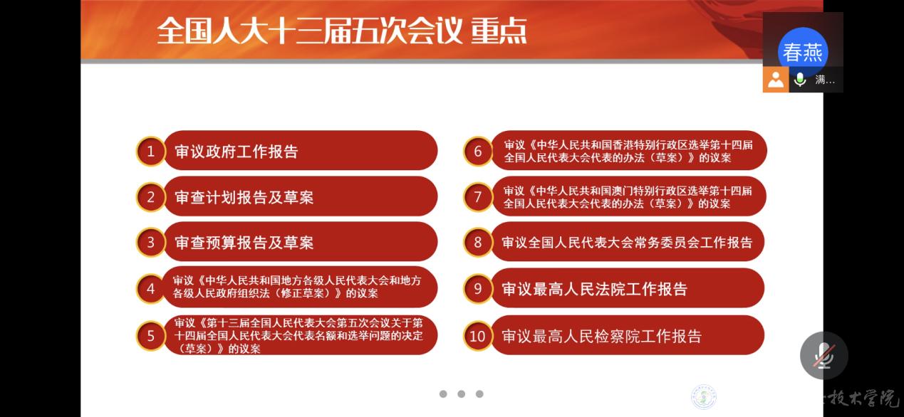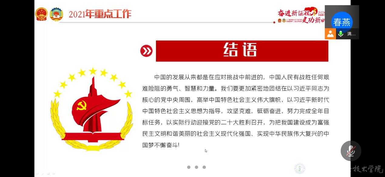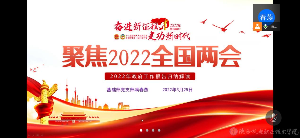 为教育引导支部党员教师准确把握时代脉搏,切实把思想和行动统一到党和国家的决策部署上来,3月25日下午,基础部党支部共聚云端,开展支部书记讲党课活动。支部书记满春燕主讲题为《奋进新征程建功新时代——聚焦2022全国两会》的专题党课,支部全体党员参加本次集体学习。