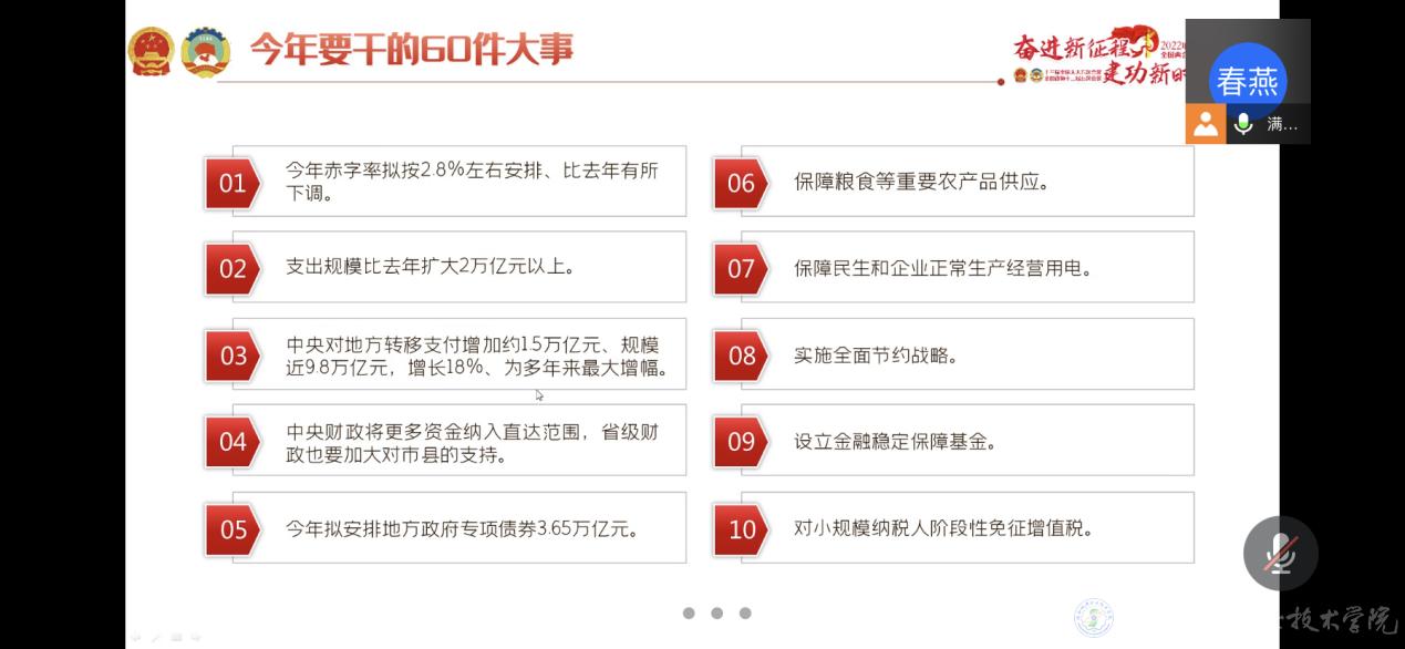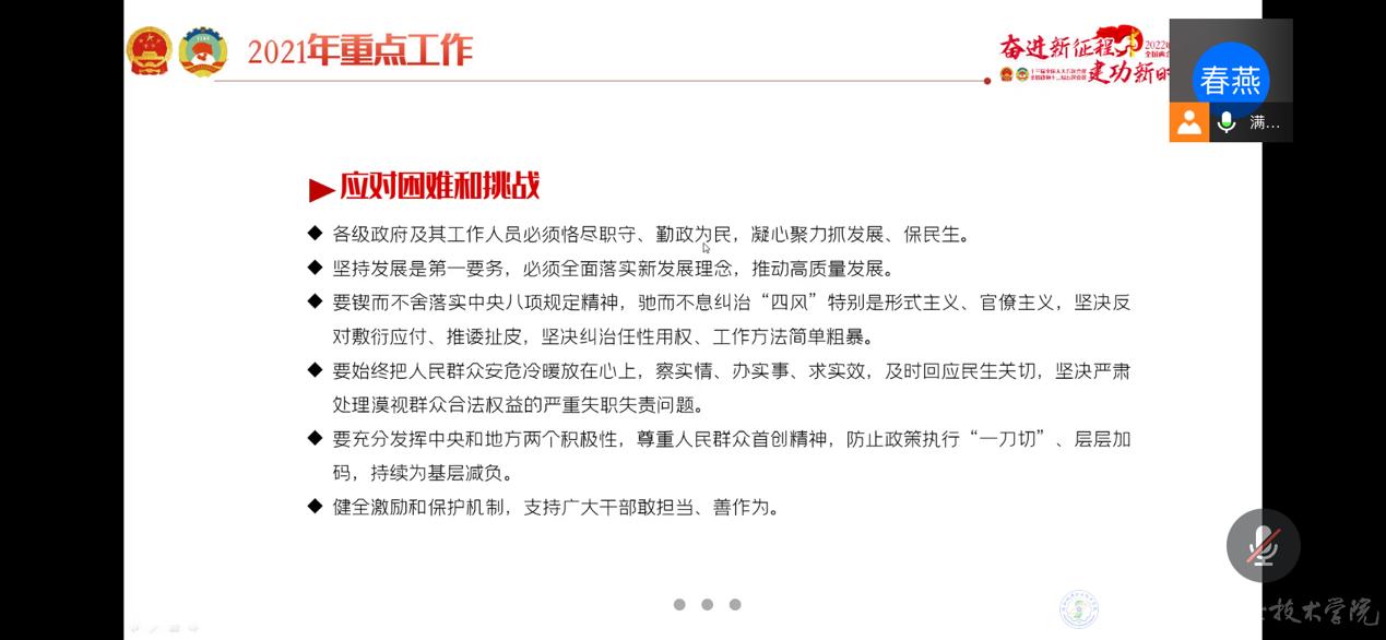 满春燕主要从2021年成绩回顾、今年形势判断、2022年发展目标、2022年工作重点、今年要干的60件大事等五个方面对政府工作报告进行解读。通过本次集体学习,各位党员更加深刻地了解了我国经济社会发展各方面取得的重大成就以及面临的机遇挑战,对中国未来发展充满希望。满春燕分析了在新冠肺炎疫情影响下国家面临的形势和任务,带领大家深刻认识党中央坚持把人民生命安全和身体健康放在第一位,坚定信心、同舟共济、科学防治、精准施策的疫情防控举措的重要性和深刻意义;她指出在宝鸡市本轮疫情中,学院坚决筑牢学校疫情防控阵线,共同守护健康、和谐、有序的家园,这来之不易的阶段性成果,凝聚着无数人的艰辛付出,鼓励大家要切实提高政治站位、履职尽责、严格把关、慎终如始。