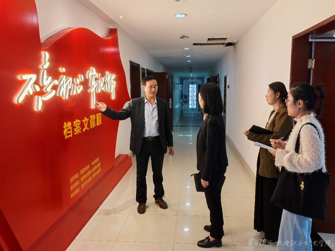 随后,闫局长引导参观了“不忘初心、牢记使命”主题教育档案文献展厅。展厅内陈列的许多珍贵的历史影像资料、文件、照片等,生动再现了党的光辉历程,现已成为党员干部群众红色教育基地。另外还有幸提前参观了即将对外开放的一个展厅,展厅通过珍贵的历史文件、照片等,生动展现了宝鸡的红色基因与城市发展脉络。康健表示,展览的策划思路与展陈方式为学校校史馆建设及红色文化育人提供了重要借鉴。